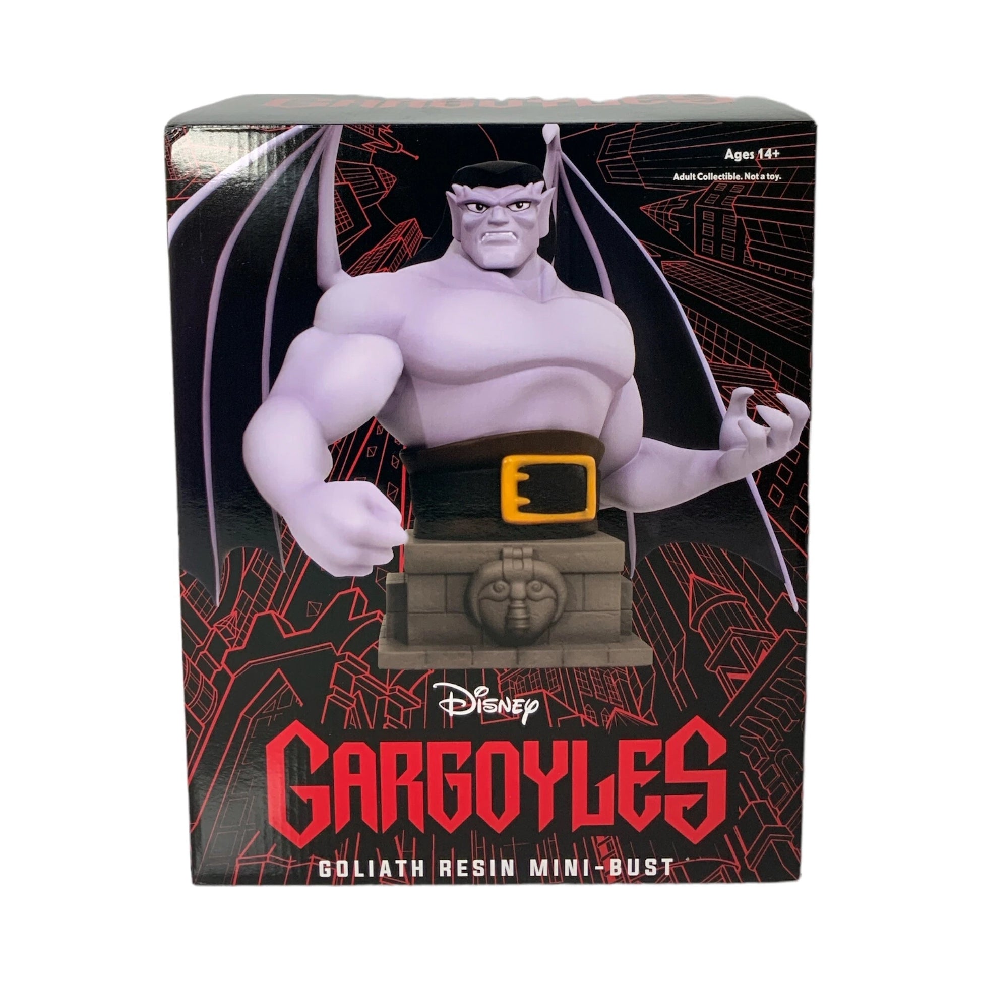 ¡Un lanzamiento de Diamond Select Toys! Surgiendo de tus mañanas de sábado de la infancia, las Gárgolas han llegado a Diamond Select Toys con una nueva línea de mini-bustos a escala 1/7. Con aproximadamente 7.5 pulgadas de alto y 9.75 pulgadas de ancho, este busto del líder del equipo, Goliath, está basado en su apariencia en la caricatura y está limitado a solo 3,000 piezas. Viene empaquetado en una caja a todo color con un certificado de autenticidad numerado. ¡Diseñado por Barry Bradfield, esculpido por Varner Studios!