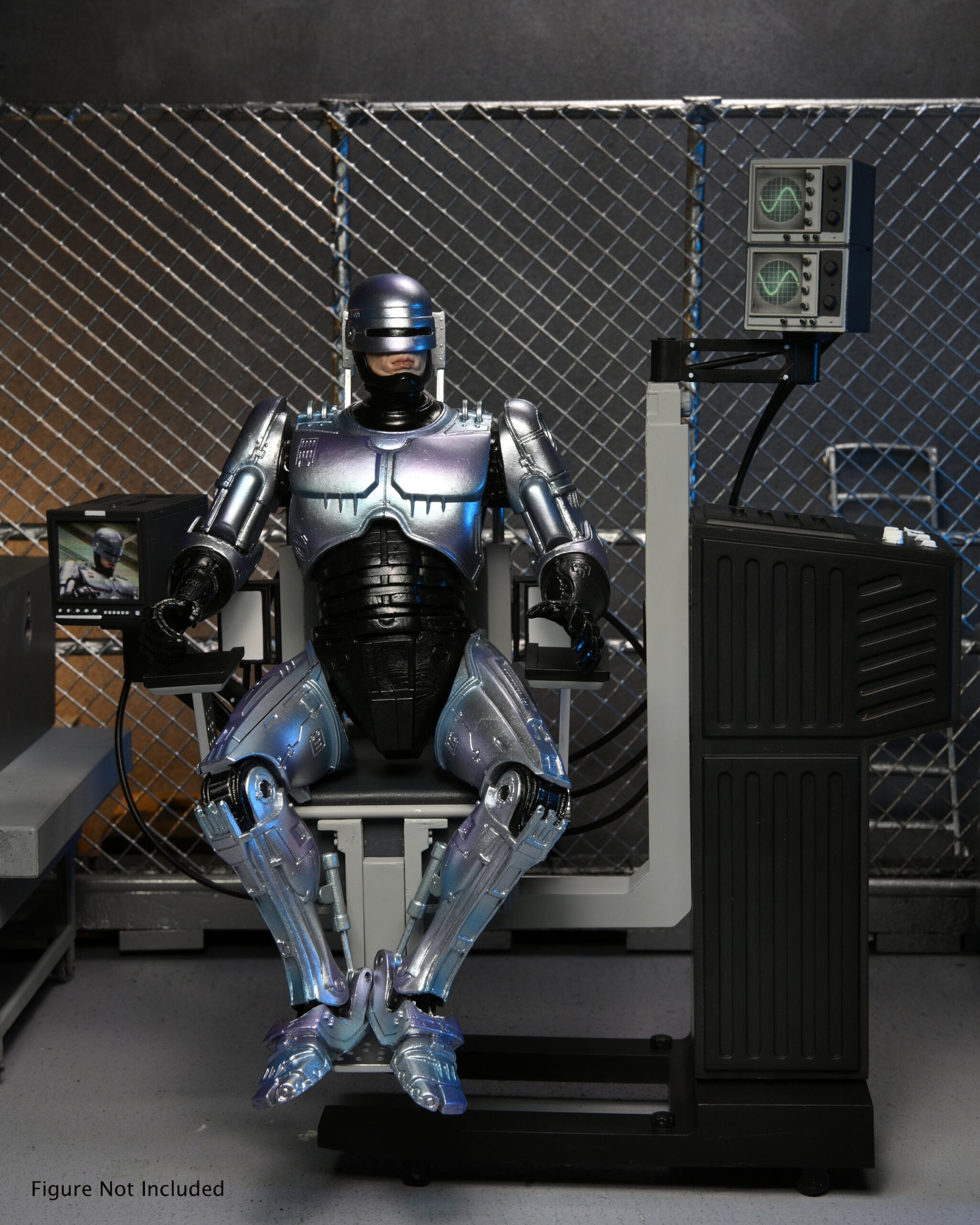 Incluye una figura de 7” con daños de batalla y una silla fiel a la película, con asiento y monitores articulados. Viene con accesorios como el puño con pincho de datos, pistola Auto-9, efecto de disparo y una cabeza intercambiable con el rostro de Peter Weller.