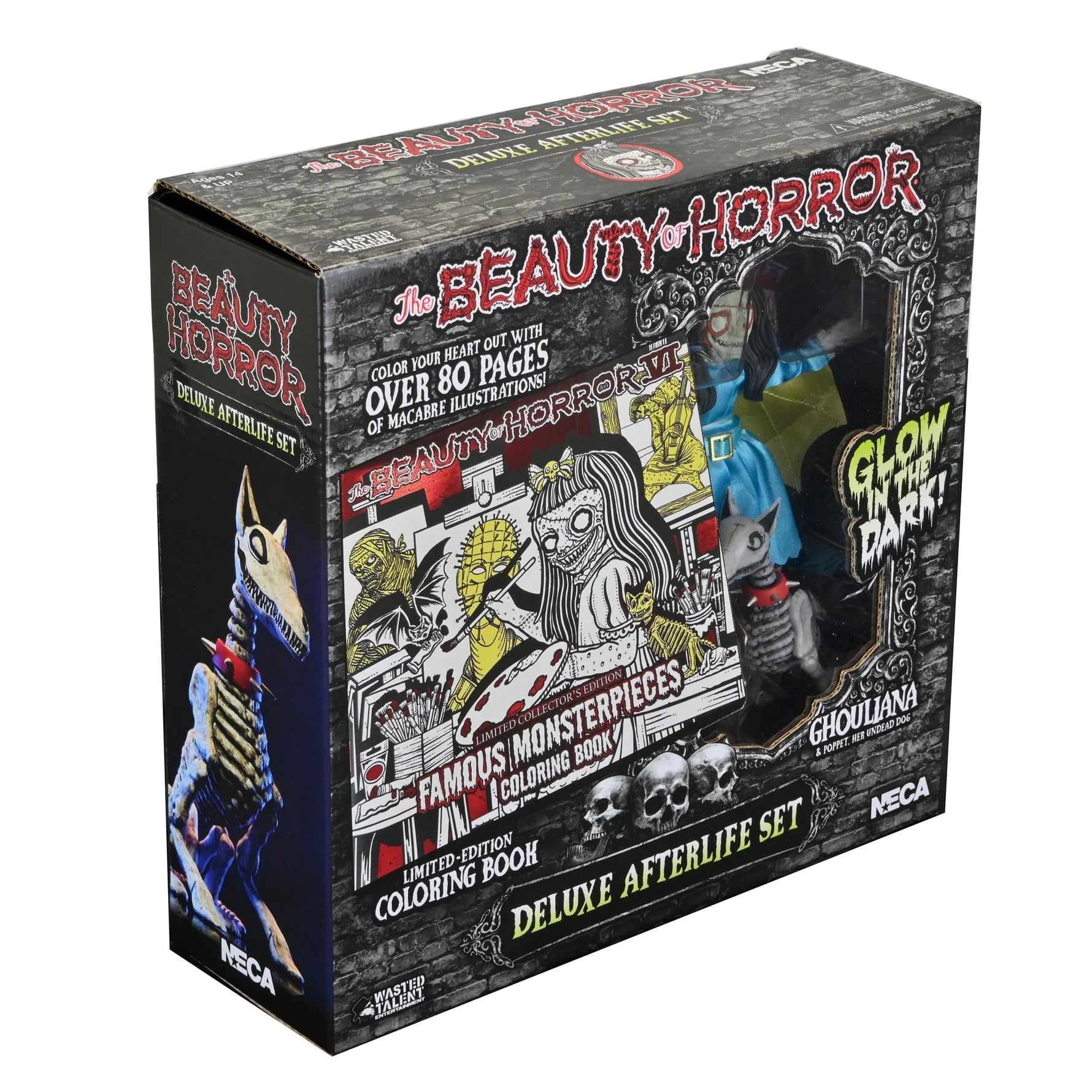 Ghouliana viene vestida con ropa de tela de estilo vintage hecha a medida y está acompañada por su leal perrito no-muerto, Poppet. Estas figuras articuladas incluyen detalles espeluznantes que brillan en la oscuridad para un toque aún más escalofriante. Este Deluxe Afterlife Set viene con una edición limitada del libro para colorear The Beauty of Horror 6: Famous Monsterpieces, ¡firmado por Alan Robert!